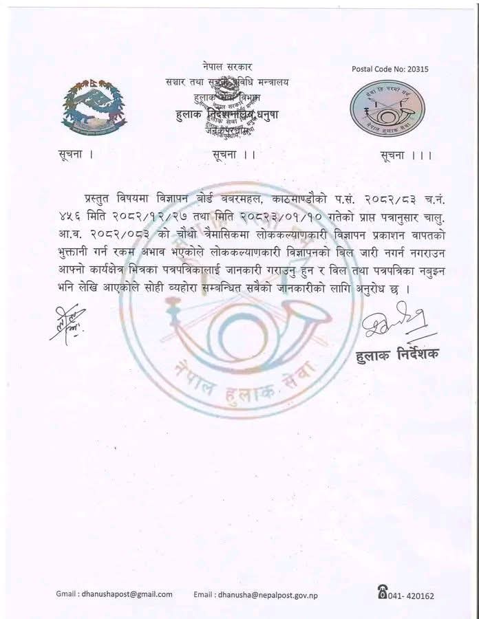 सञ्चार तथा सूचना प्रविधि मन्त्रालय अन्तर्गत रहेको हुलाक सेवा विभाग, हुलाक निर्देशनालय धनुषाले चालु आर्थिक वर्ष २०८२/०८३ को चौथो त्रैमासिकमा विज्ञापन वापतको भुक्तानी गर्न रकम अभाव भएको जनाउँदै तत्कालका लागि बिल जारी नगर्न स्पष्ट निर्देशन दिएको छ।